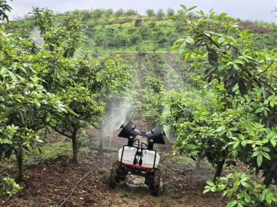 六轮无人植保车给花椒树施药。新华社记者周凯 摄