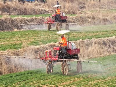3月23日,在山东省荣成市虎山镇,农机手对小麦进行施肥和病虫害防控作业。新华社发 李信君 摄
