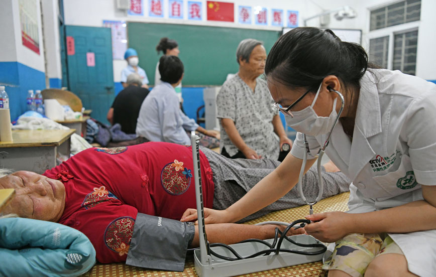 7月20日,安徽淮南市谢家集区望峰岗小学安置点,村医李菊为二道河村转移过来的群众义诊。