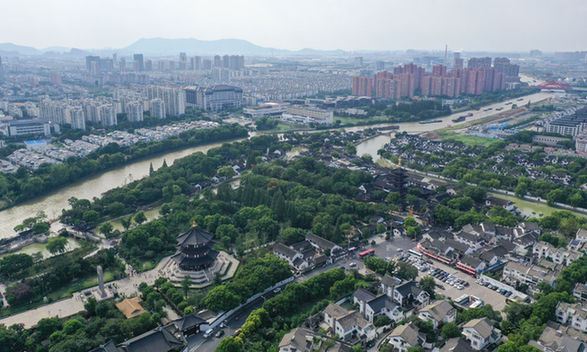 无人机航拍的运河边的苏州寒山寺(8月9日摄)。