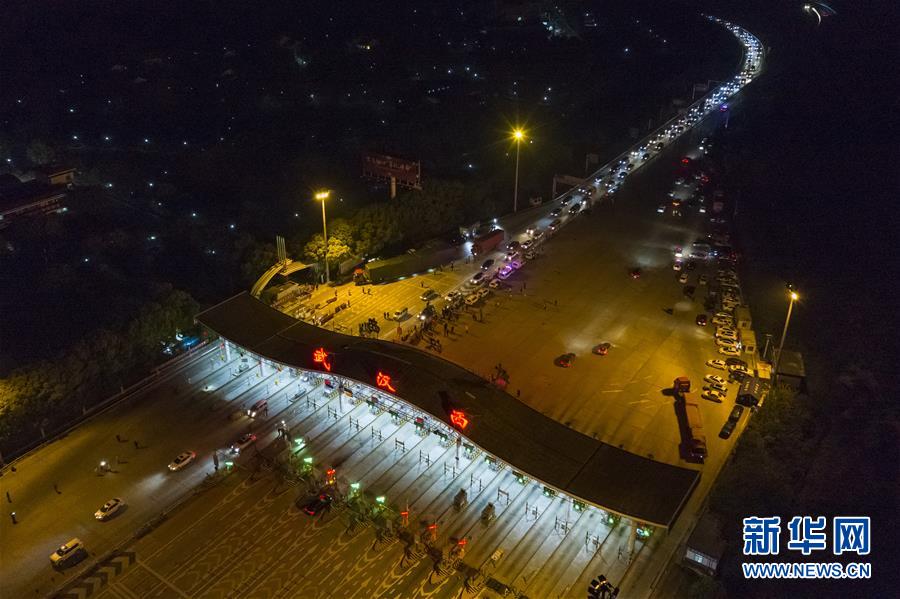4月8日凌晨,车辆通过武汉北高速收费站(无人机照片)。 新华社记者 肖艺九 摄