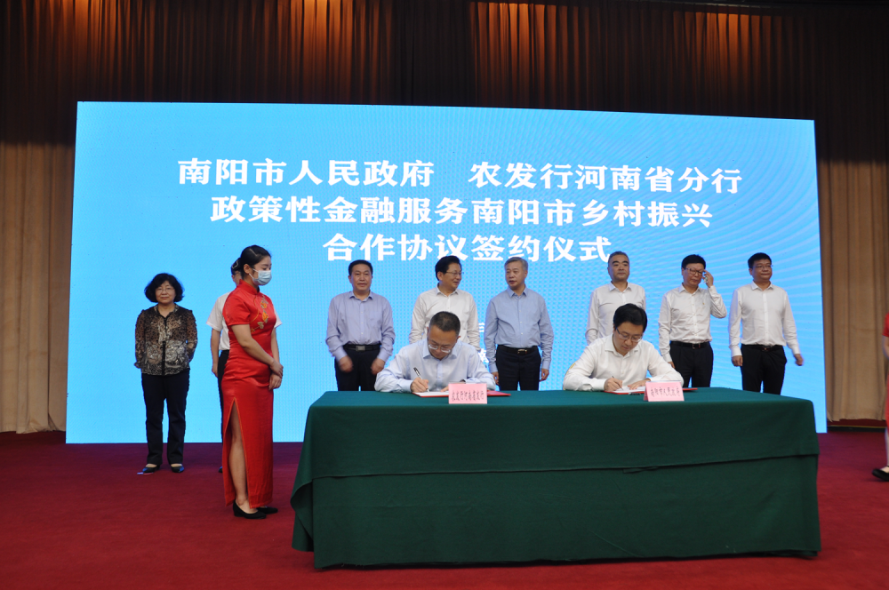 大美南阳,秋高气爽。9月1日,南阳市政府与河南农发行在白河之滨——南阳宾馆隆重举行仪式,签订《南阳市人民政府中国农业发展银行河南省分行政策性金融服务南阳市乡村振兴合作协议》。南阳市市委书记朱是西,农发行总行首席风险官兼河南省分行党委书记、行长李小汇出席签约仪式并致辞。南阳市政府副市长范勇,河南省分行副行长王福利分别代表政银双方签定协议,签约项目151个、意向融资947亿元。