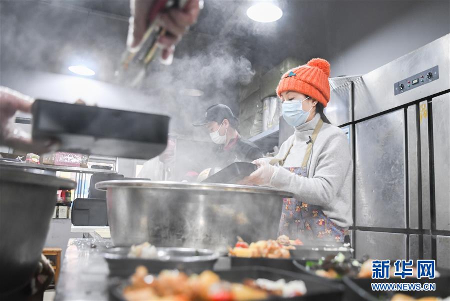 2月26日,爱心人士“雨衣妹妹”(右)在分装盒饭。 新华社记者 程敏 摄