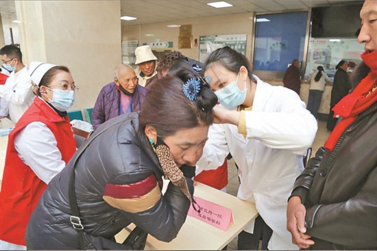 图为医疗队专家为患者做耳部疾病检查。记者 贡秋曲措 通讯员 梁侠 潘树仁 摄