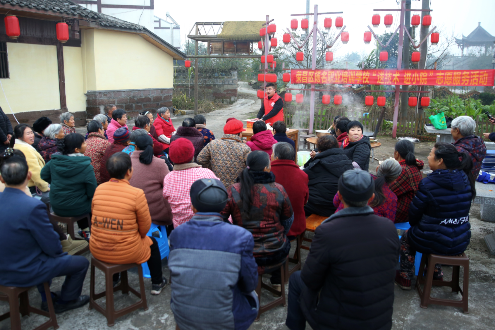 “腊八节,喝腊八粥,寓意祈福丰收、安康吉祥……”活动现场,荣昌区扬名职业培训学校的老师认真讲解着腊八节的习俗。一旁的大铁锅里熬煮的腊八粥咕嘟作响,翻滚着红枣、红豆、莲子、糯米等食材,浓郁的甜香弥漫整个小院。